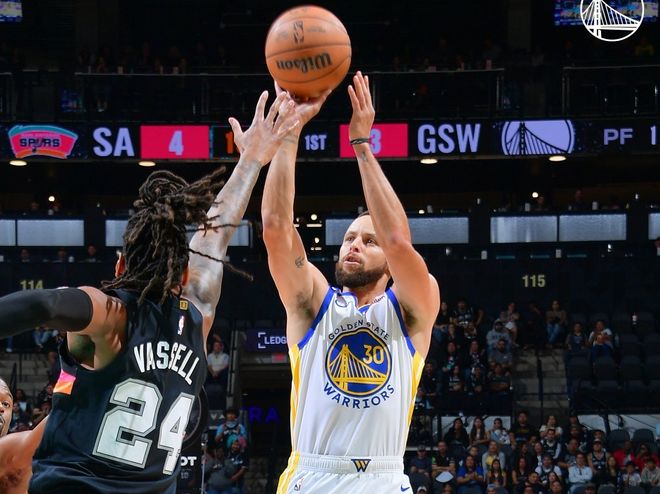 库里跳投+巴特勒三分止血,半场勇士追到49-56。进入第三节,不断在防守端被点名的库里终于爆发,突破造犯规后顶着文班亚马强投三分,随后借掩护再中三分!巴特勒三分球续上火力,库里继续造犯规+造三分犯规!中段库里撤步三分反超打停马刺,急停中距离跳投还有,跳投打板也中!节末巴特勒和霍福德内外开花,三节结束时,勇士92-84马刺。决战第四节,福克斯联合文班亚马追上比分,巴特勒和理查德下三分雨,此后双方陷入胶着。最后5分钟,库里和文班亚马对飙三分,此后库里继续造杀伤,文班亚马补篮。